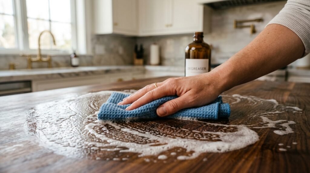 Kitchen environments are saturated with airborne cooking oils that create an invisible barrier on surfaces. To ensure paint adhesion, you must clean the island with TSP (Trisodium Phosphate) or a high-strength degreaser. This step is more critical than sanding; if you sand over grease, you simply grind the oils into the wood grain, which will cause the paint to peel in the future.