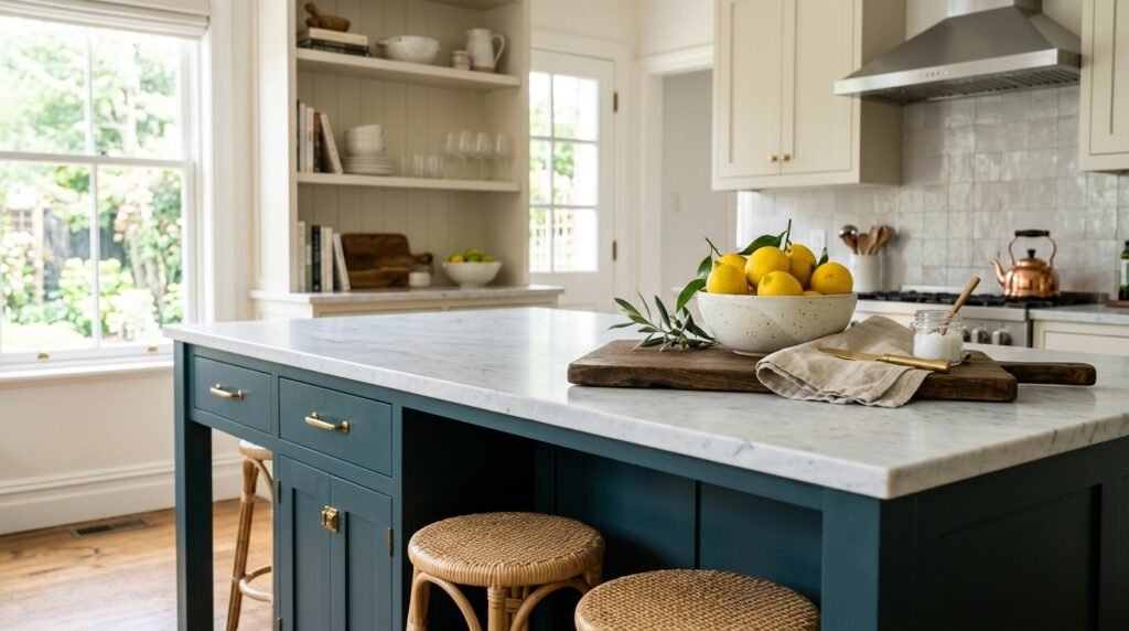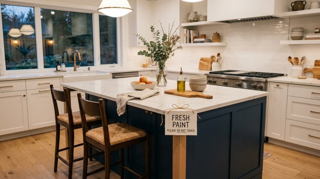 If you are documenting your DIY success for a blog or social media, focus on “Appetizing Realism.” Style the island with natural textures like wood boards and fresh fruit. Use side-lighting from a window to highlight the matte texture and the lack of brush strokes. This professional-grade imagery validates the high-quality result of your budget-friendly upgrade.