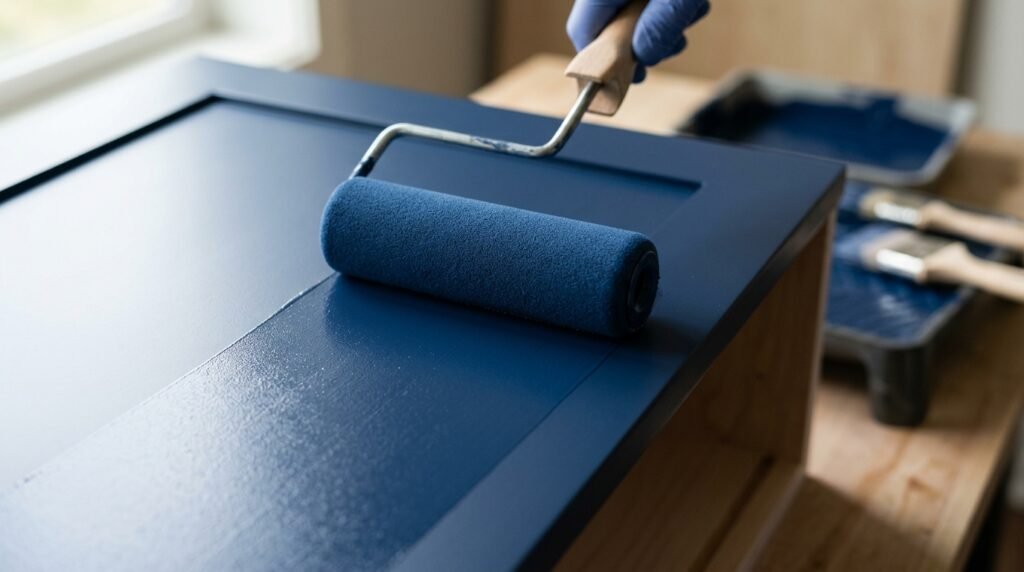 To get a professional look without an expensive sprayer, use high-density foam rollers. These rollers do not have a “nap,” meaning they don’t leave the orange-peel texture associated with standard rollers. Apply the paint in thin, even coats, and “back-brush” any corners with a high-quality synthetic brush.