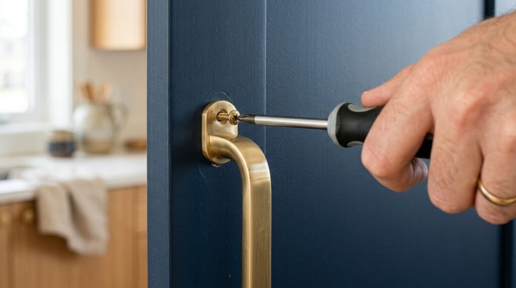 Your budget makeover isn’t complete without new hardware. Swapping old pulls for brushed brass, matte black, or honey bronze hardware provides the necessary contrast to make the new paint color pop. In modern design, oversized handles (6 inches or longer) are preferred to give the island a more architectural and custom-built appearance.