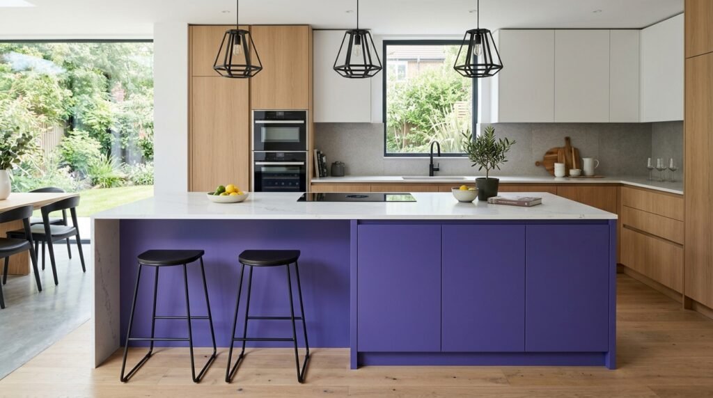 While neutrals are safe, the current trend is shifting toward “NeoBrand” color drenching for islands. Using a saturated, modern hue—like a deep architectural purple—creates a graphic focal point that looks incredible in digital photography and editorial layouts. A bold island paired with neutral perimeter cabinets provides a curated, designer look for the cost of a single gallon of paint.