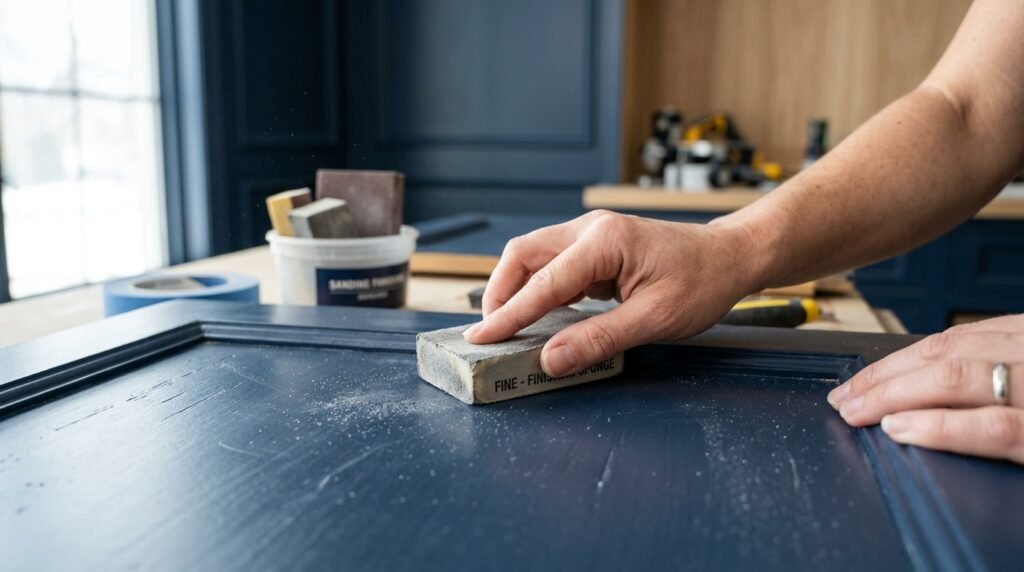Professional painters always sand between coats. Once the first coat of paint is dry, use a 320-grit or 400-grit sanding sponge to lightly buff the surface. This removes any dust motes or bubbles that settled during drying. This tiny extra step is what makes the final surface feel like factory-installed cabinetry.