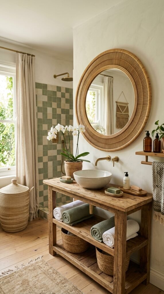 A rattan mirror adds elegance and functionality, reflecting light and making rooms feel larger. Its organic shape and texture contrast beautifully with sleek, modern elements. Pair it with sage green accents for a calming effect.