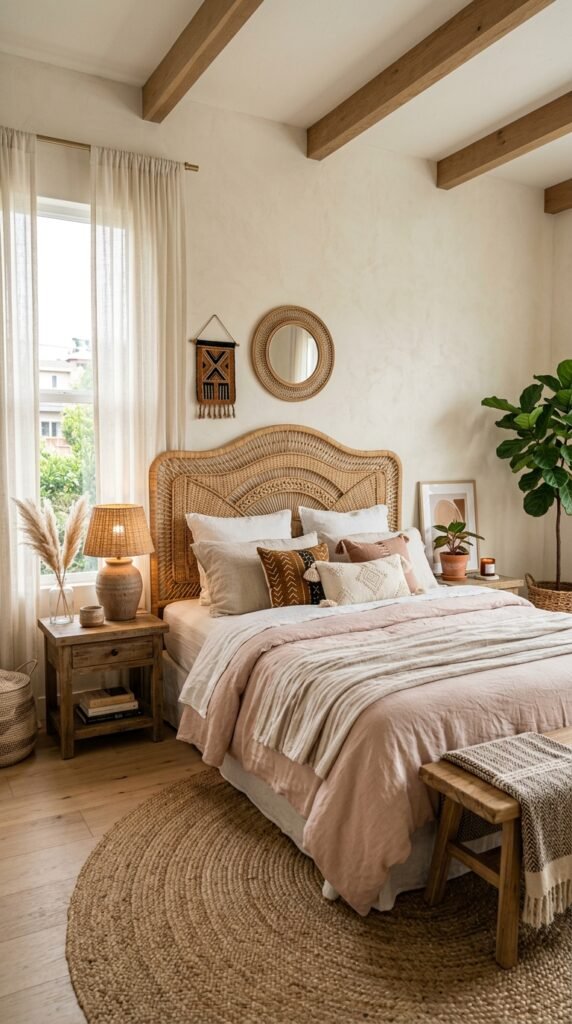 A rattan headboard adds warmth and texture to the bedroom, creating a cozy retreat. Its natural tones pair beautifully with linen bedding and blush pink accents. This piece works especially well in minimalist or Scandinavian-inspired spaces.