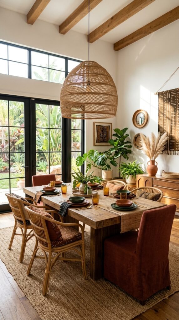 A rattan pendant light instantly becomes the focal point of any room, casting a soft, warm glow that enhances the ambiance. Opt for a large, oversized design to make a statement, especially in dining or living areas. Pair it with terracotta accents and deep green foliage to amplify the Afrohemian vibe.