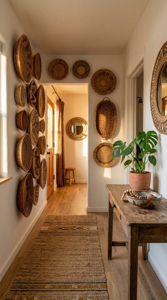 A wicker basket wall is both functional and artistic, offering storage while doubling as a statement piece. Mix baskets of different sizes and shapes for visual interest. Incorporate mustard yellow accents to tie the look together.