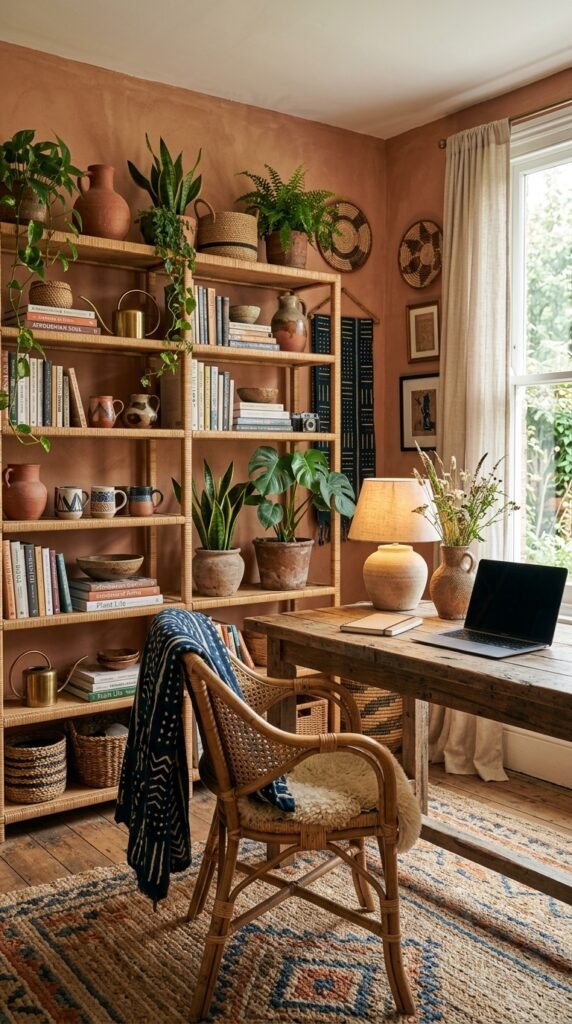 Rattan shelving offers open storage while adding a lightweight, airy feel to any room. Display handmade pottery, books, and plants to personalize the space. Pair it with terracotta accents for a cohesive Afrohemian look.