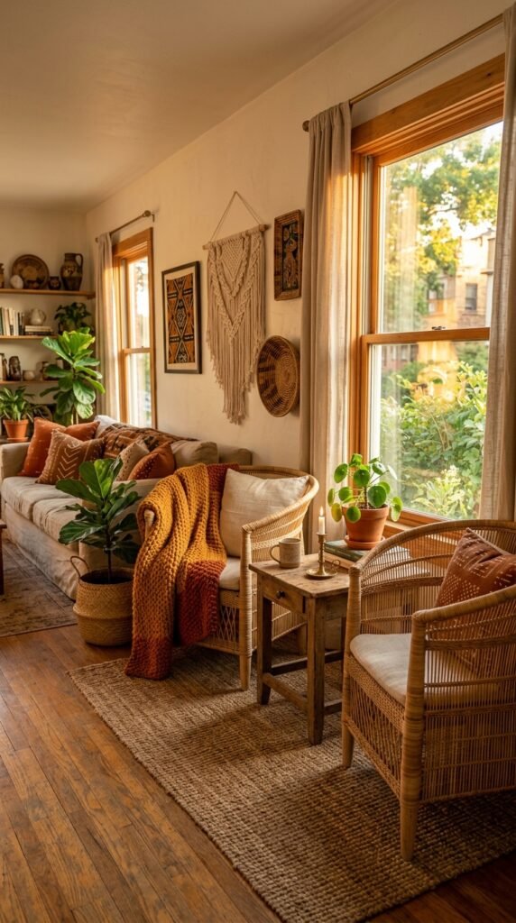 Wicker planters are the perfect way to bring indoor greenery into your space while staying true to the Afrohemian aesthetic. Their natural texture complements lush plants like fiddle leaf figs or monstera. Pair them with a rattan sofa for a cohesive look.