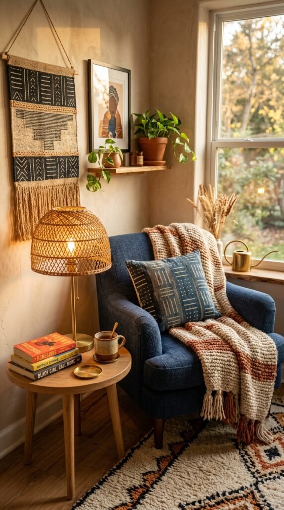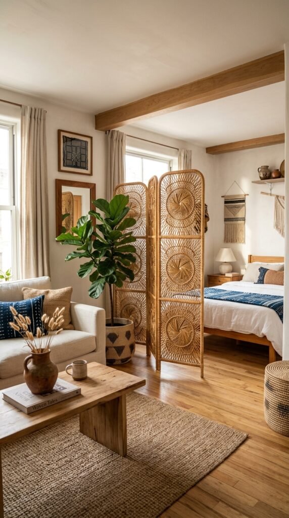 In open-plan homes, a rattan room divider provides privacy without sacrificing airflow or light. Its intricate patterns create a sense of movement and artistry. Pair it with indigo textiles and clay pottery to enhance the Afrohemian aesthetic.