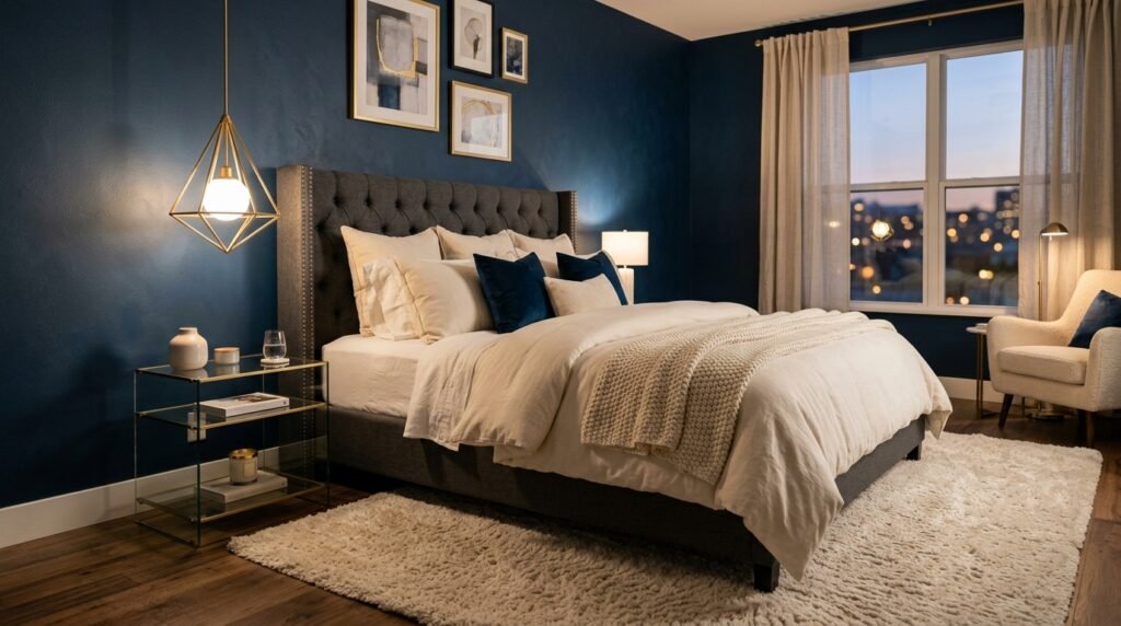 Practical tip: Balance dark walls with light-colored furniture and metallic accents for a harmonious look.