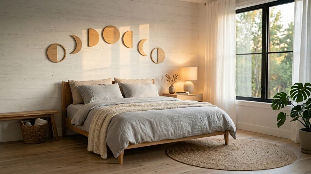 Hang a series of wooden moon phase discs above your bed for a subtle yet striking celestial touch. Opt for natural oak or walnut for warmth. This decor piece works beautifully in Scandinavian or minimalist spaces.