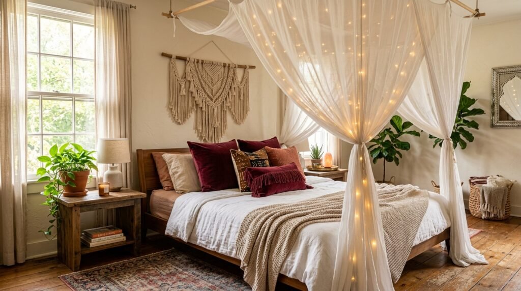 Why it works: The canopy adds softness and intimacy, while the lights create a warm, dreamy ambiance.