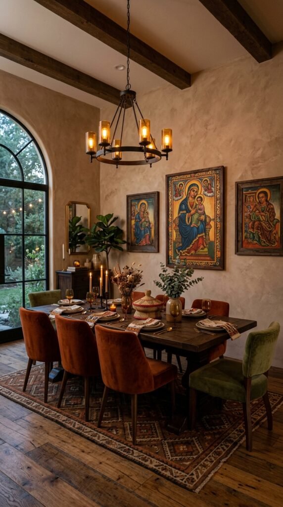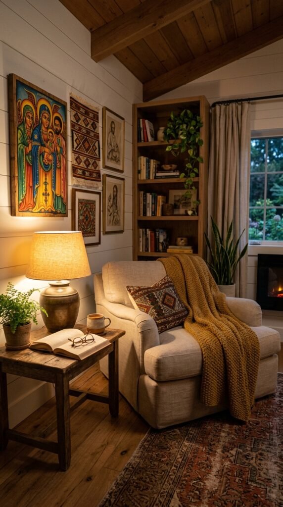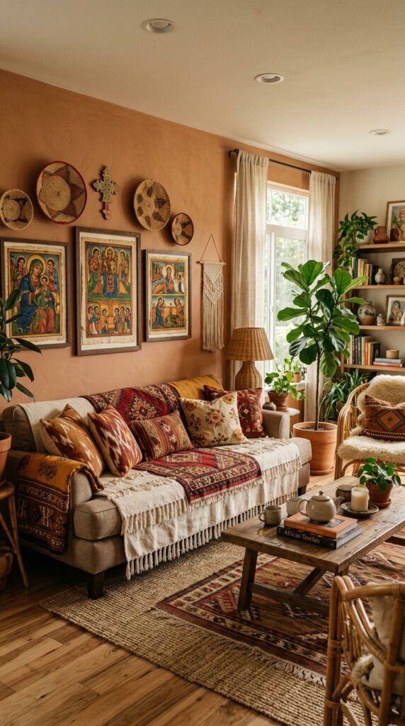 Layer your space with global textiles like Moroccan rugs or African mud cloth to create a rich, multicultural vibe. The textures and patterns will complement the art without competing. Pro tip: Use neutral base colors to keep the look cohesive and grounded.