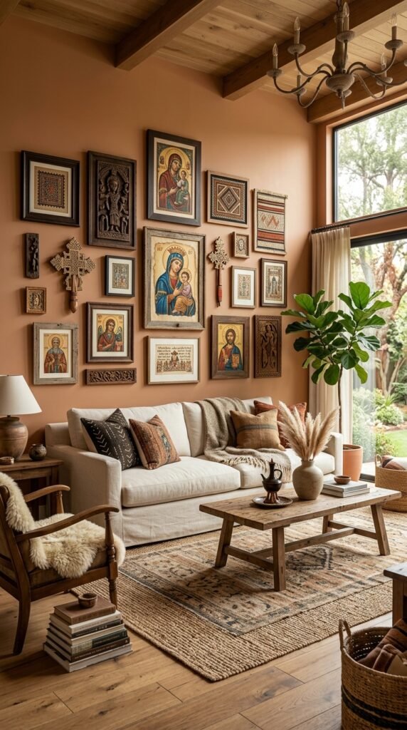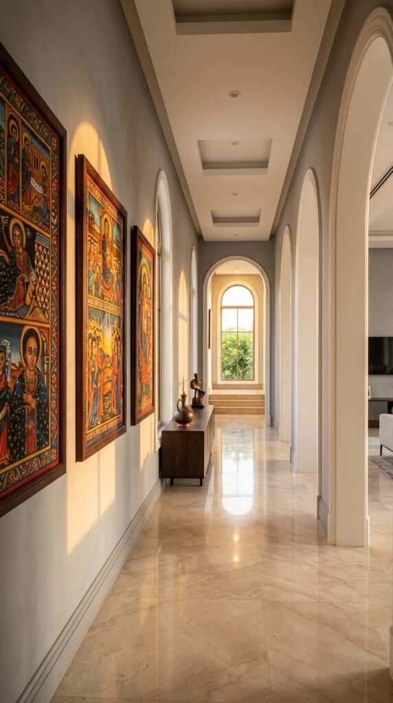 A gallery wall is a timeless way to showcase Ethiopian art, but mixing sizes adds depth and movement. Pair larger pieces with smaller ones to create visual balance. Use natural wood frames to complement the art’s earthy tones. Pro tip: Lay out your arrangement on the floor first to ensure harmony before hanging.