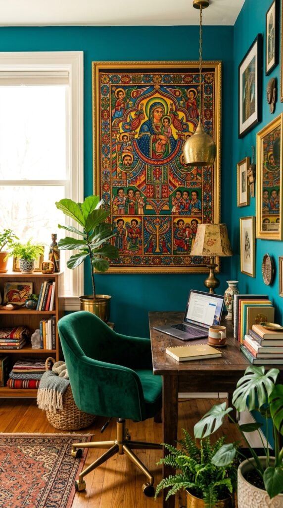 Don’t shy away from bold colors—embrace them! Hang your Ethiopian art against a deep teal or burnt orange wall to make it pop. Add metallic accents like gold or brass to elevate the space. This approach is perfect for home offices or creative studios where energy is key.