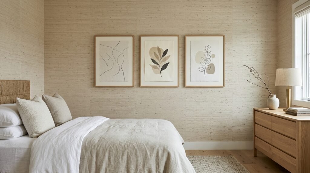If you want to go beyond paint, grasscloth wallpaper is the professional choice for small, cozy bedrooms. It introduces a subtle, organic “weave” to the walls that absorbs light and sound.