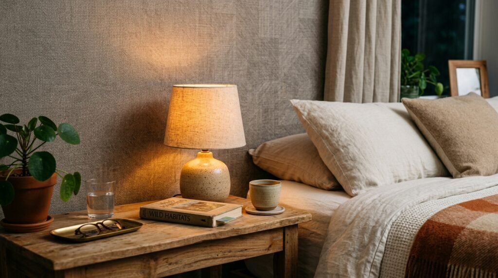Texture is invisible without the right light. Standard overhead lighting flattens the room. To highlight the “grain” of your blankets and curtains, use low-level, warm lighting (2700K bulbs).