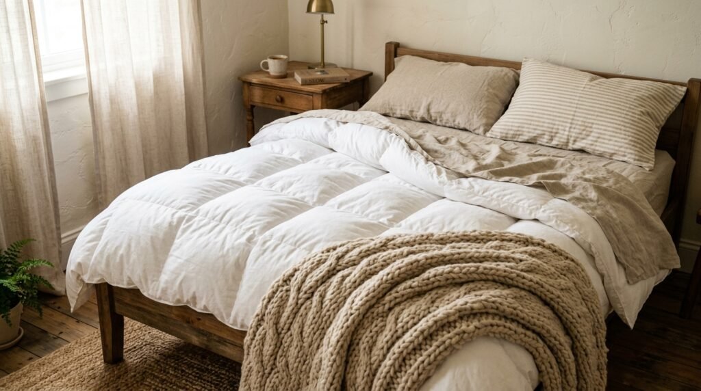 - Pro Tip: Mix your materials. Use a crisp cotton fitted sheet, a stone-washed linen duvet cover for that organic “crumple,” and a heavy wool blanket at the foot. This triple-layering creates depth without taking up extra floor space.