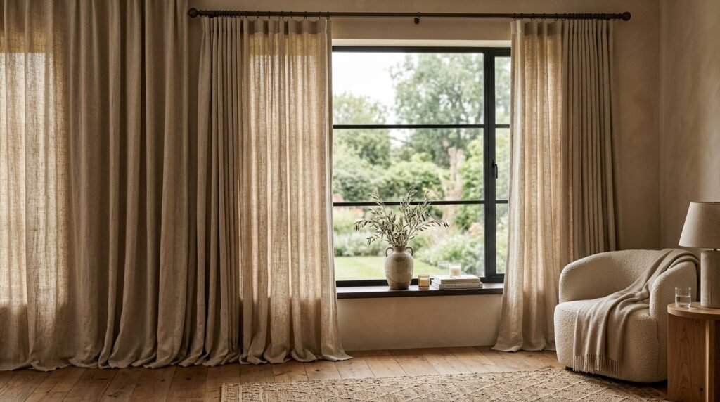 - Why it works: By extending the fabric from the ceiling to the floor, you essentially create a “soft wall.” This masks the hard lines of the window and provides a layer of thermal insulation that makes the room feel physically warmer and more “tucked in.”