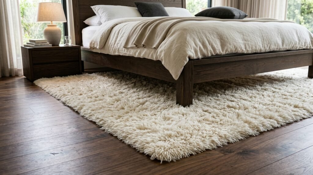 - The Designer Secret: If your room is too small for a large area rug, layer a small faux-sheepskin or a long-hair Moroccan rug directly where your feet land in the morning. This “vertical” texture contrast against a hard floor provides an immediate sensory signal of comfort.