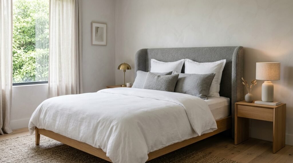 A wooden or metal headboard can feel cold and rigid in a tight space. An upholstered headboard—specifically in a tactile fabric like bouclé or velvet—adds another layer of soft surfacing.