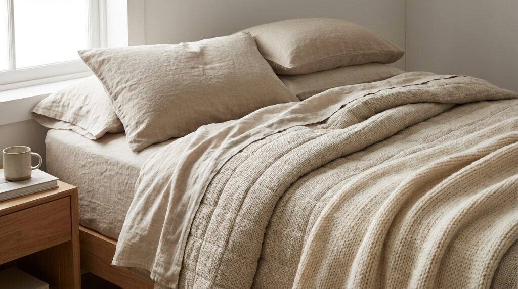 To achieve a professional look, layer your bedding. Start with a high-quality cotton base, add a medium-weight quilt for structure, and finish with a heavy knit throw at the foot of the bed. This “3-layer” approach creates visual depth and makes the bed look grounded and substantial.