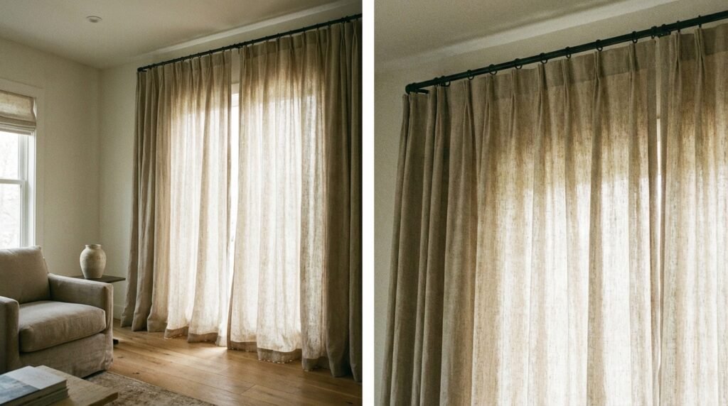 Windows are often overlooked, but they represent a large surface area that can either feel cold (glass) or warm (fabric). To make a bedroom inviting, use floor-to-ceiling curtains. Linen drapes are excellent for this; they have a heavy “drop” that looks expensive and provides a soft, diffused light during the day.
