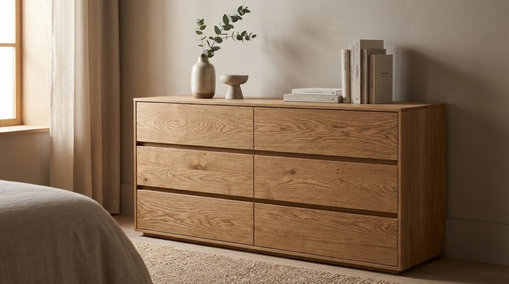 Materials like plastic or high-gloss lacquer can feel synthetic and “cold.” To build a warm aesthetic, prioritize natural wood. The visible grain of oak, walnut, or pine brings a rustic, “grounded” feeling to the bedroom. Wood is a natural insulator and has a visual “softness” that stone or metal lacks.