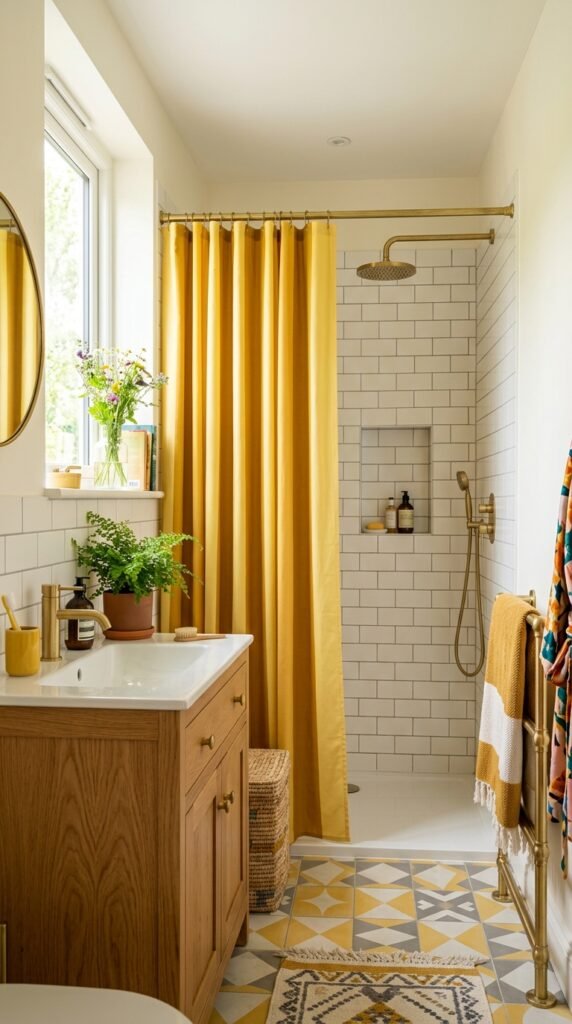 A striped shower curtain in sunny yellows like mustard adds a playful touch to a bathroom. The white subway tiles and wooden vanity keep the space light and fresh. The stripes create a cheerful focal point that energizes the room.