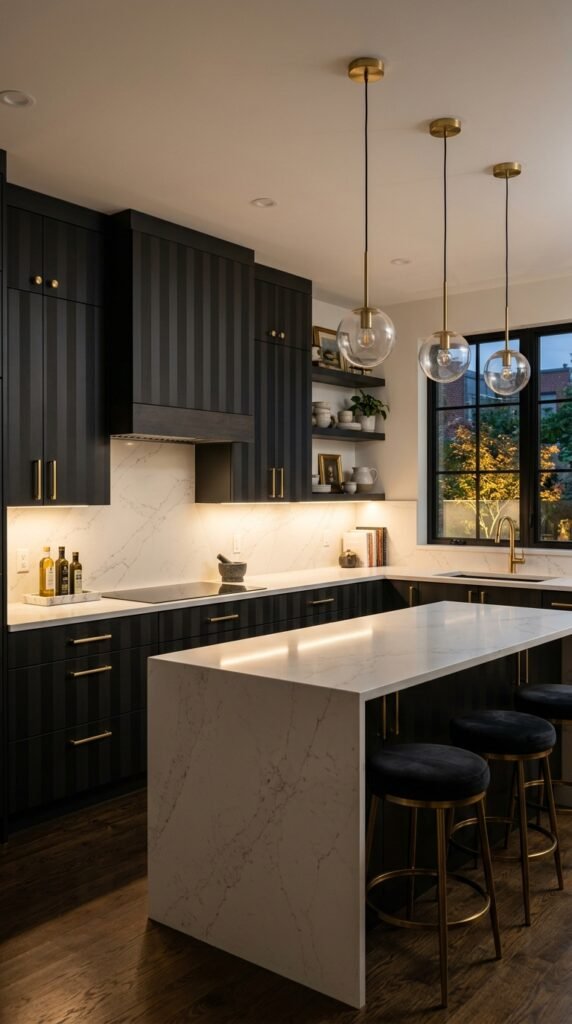 Striped cabinet doors in black and charcoal add a bold statement to a kitchen. The gold hardware and quartz countertops elevate the space with a touch of glamour. The stripes create a dynamic visual effect that draws the eye across the room.