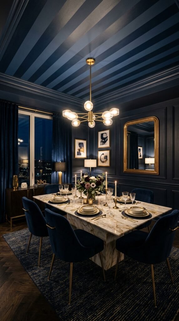 A striped ceiling in deep blues like navy and midnight creates a dramatic focal point in a dining room. Pair it with a marble table and brass accents for a luxurious touch. The stripes draw the eye upward, making the room feel larger.