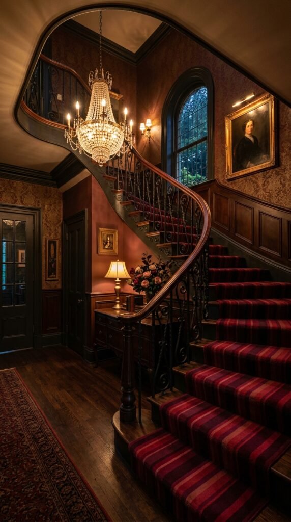 A striped stair runner in rich reds like burgundy adds drama to an entryway. The wrought iron railing and chandelier complement the boldness of the stripes. The pattern creates a sense of movement and guides the eye upward.