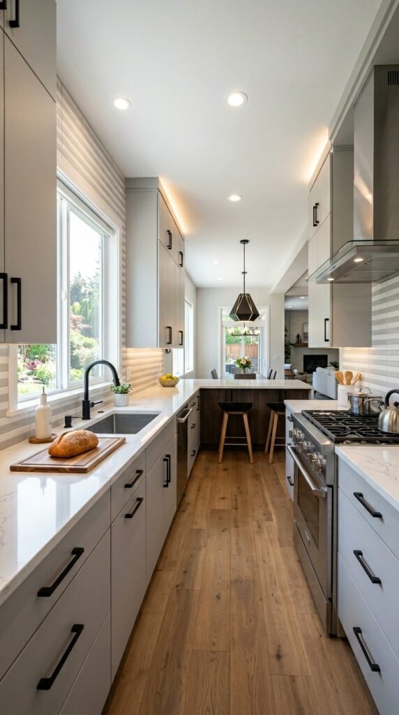 A striped tile backsplash in white and gray adds a modern twist to a kitchen. Pair it with quartz countertops and matte black hardware for a sleek look. The stripes create a sense of rhythm and movement in an otherwise static space.