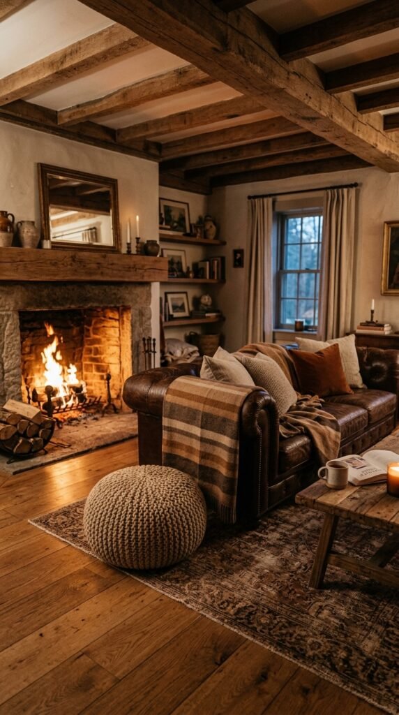 Striped throw blankets in earthy tones like brown and tan add warmth to a living room. The leather sofa and knit pouf enhance the cozy, rustic vibe. The stripes create a sense of texture and depth, perfect for a snug space.
