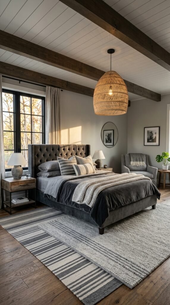 Layered Striped Rugs in a Monochrome Bedroom
