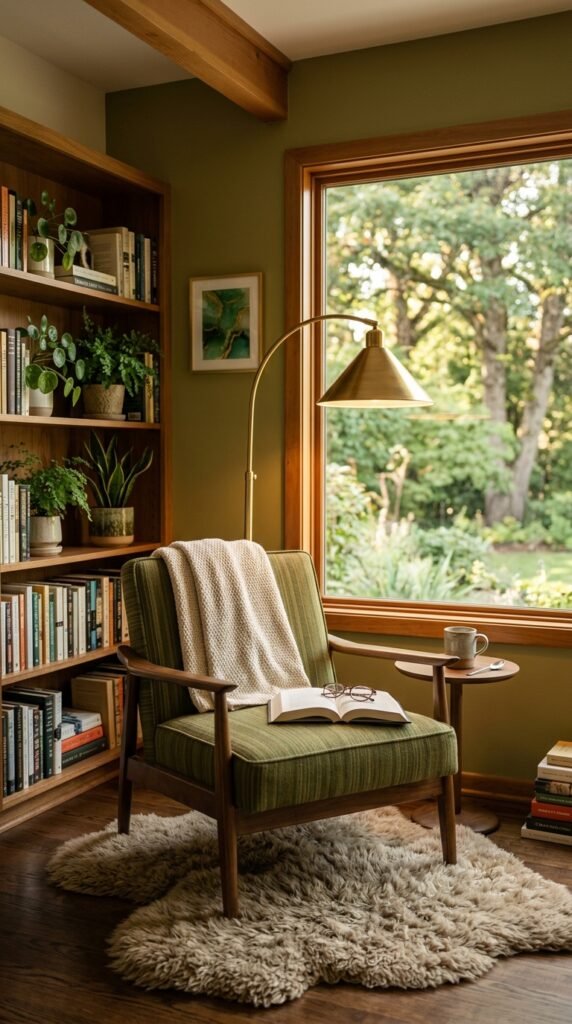 Striped upholstery on a statement chair in shades of green adds a pop of color and pattern to a reading nook. The brass floor lamp and sheepskin rug complement the chair’s vibrancy. The stripes create a focal point without overwhelming the small space.