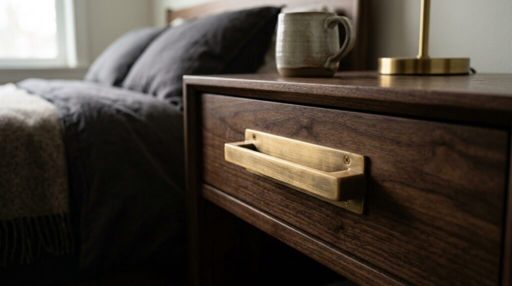Dated handles on nightstands and dressers can make high-quality furniture look cheap. Swapping standard pulls for brushed brass, matte black, or leather tabs is a 20-minute task that provides an instant “custom furniture” look.