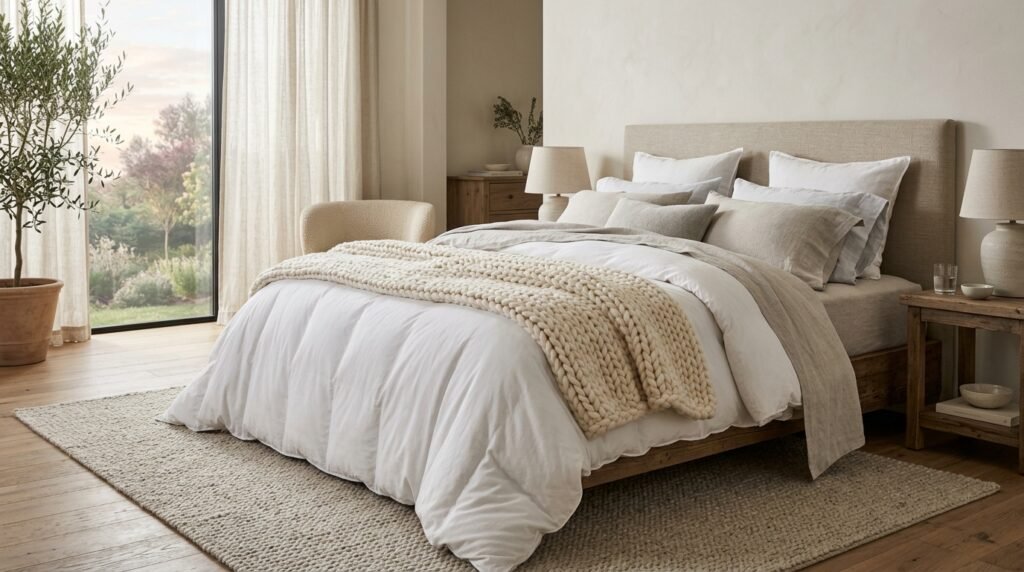 The bed is the architectural center of the room. To make it feel like a luxury hotel, use the “oversizing” trick: place a King-sized duvet on a Queen-sized bed. This creates deep, soft folds that hide the bed frame. Layer three different textures—linen, cotton, and wool—to provide visual depth and a “cloud-like” appearance.