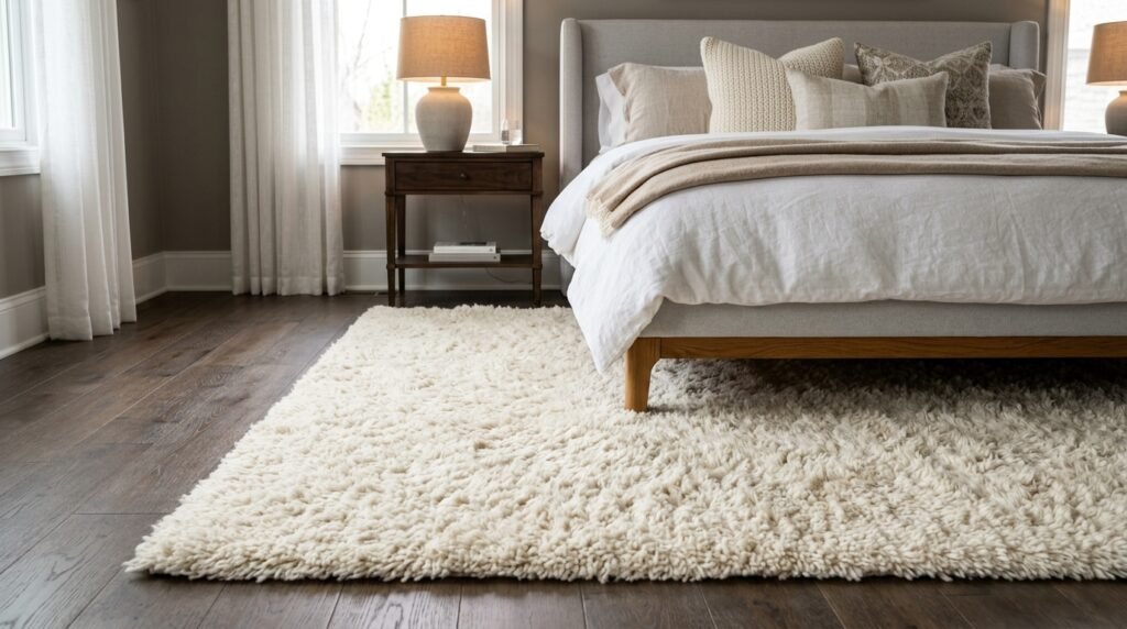 A rug should be a tactile experience. Placing a high-pile or faux-sheepskin rug specifically where your feet hit the floor in the morning provides an immediate sensory boost. It also “zones” the bed area, making the room feel more organized.