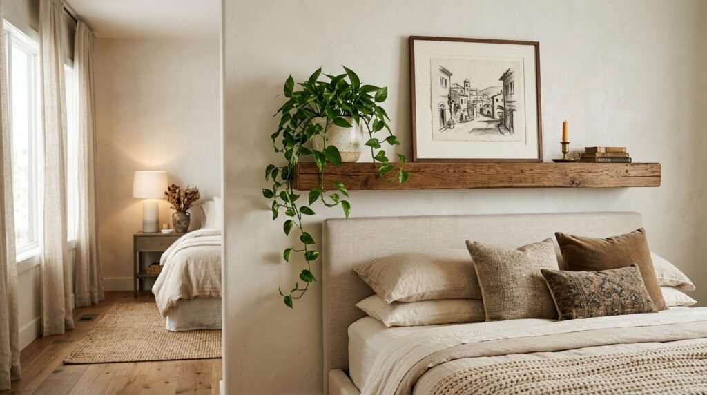 If you lack floor space, use vertical real estate. A single, thick wood floating shelf can hold a trailing plant (like a Pothos) and a piece of art. This adds a living element and personalized character without cramping the room’s layout.